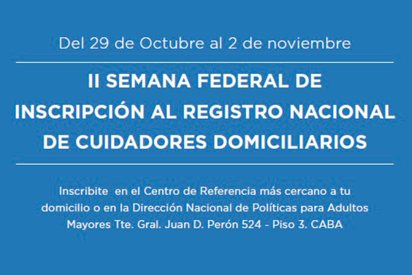 Considerando fundamental que las personas mayores tengan acceso a datos confiables de cuidadores domiciliarios con formación y en el marco del mes del Adulto Mayor, desde el pasado lunes 29 de octubre y hasta el 2 de noviembre, el Ministerio de Salud y Desarrollo Social – DINAPAM – realiza una semana especial de Inscripción al Registro Nacional de Cuidadores Domiciliarios para los/las egresados que deseen incluirse en la base de datos contenida en la página web http://registroncd.senaf.gob.ar