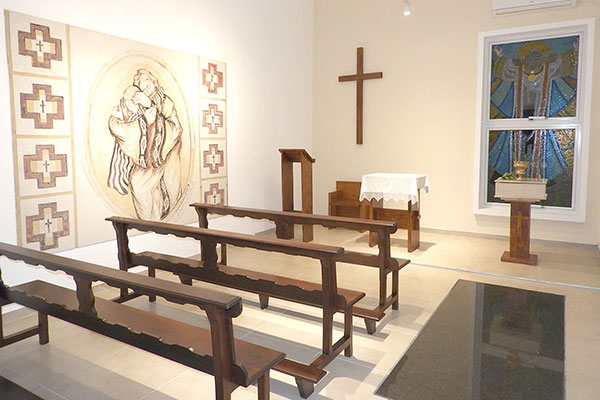 Además agradeció especialmente a la artista Mónica Corrales y a su esposo, Eduardo Díaz Hermelo, conocidos por el embellecimiento del Santuario de Fátima y quienes crearon el esgrafiado “Padre de las Misericordias”. La obra está ubicada en la pared izquierda de la capilla cinerario y se impone por su belleza y por su tamaño. Justamente ella fue la que le dio el nombre al lugar. La imagen tiene un profundo sentido cristiano puesto que simboliza el abrazo apretado que el hombre, después de su final te-rreno, recibe de Cristo.