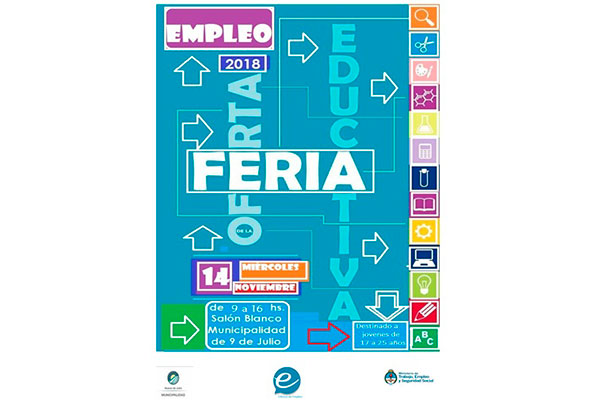 El gobierno de la Nación, la Provincia y la Municipalidad de Nueve de Julio realizarán un evento que apunta a jóvenes vecinos de la Ciudad de entre 18 y 24 años: la “Feria Educación y Empleo Joven”.