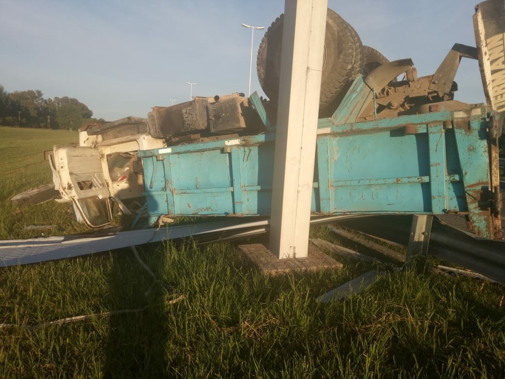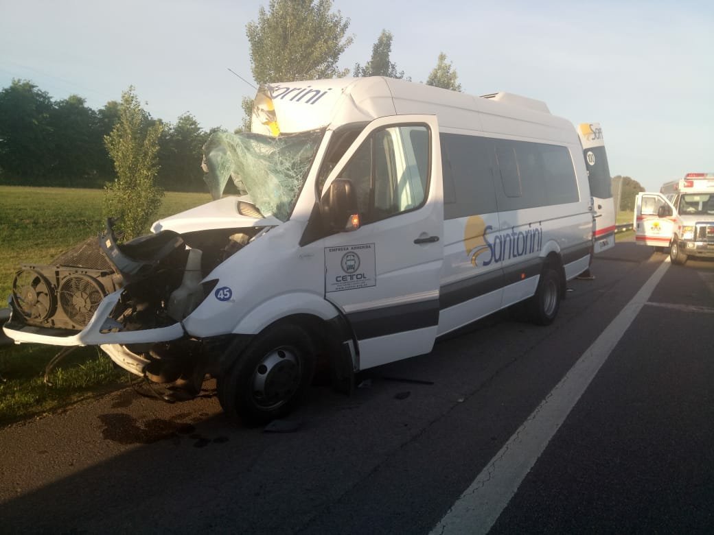 Un camión chocó esta mañana con una combi de la empresa Santorini Turismo y terminó volcado sobre la banquina. El hecho ocurrió en las primeras horas del día en acceso oeste poco antes del cruce con ruta 6.