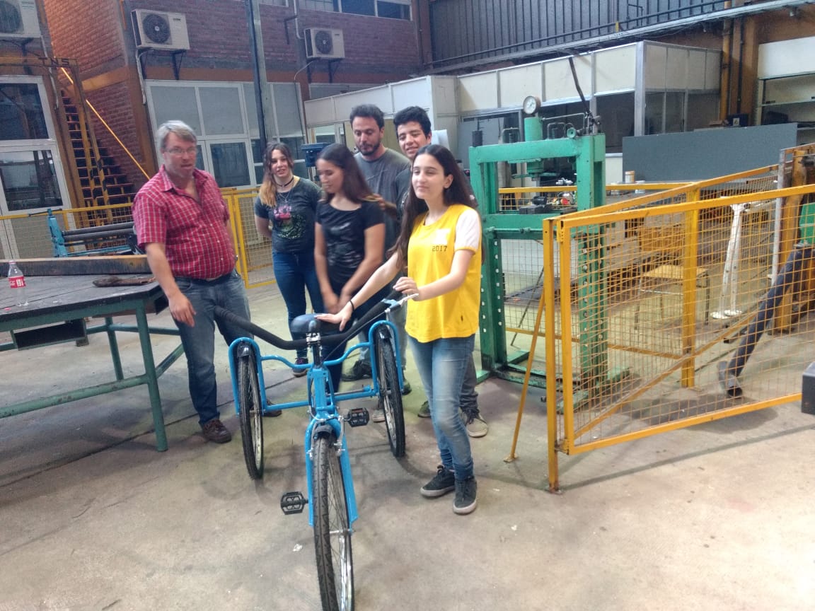 Hace 2 meses, se acerca a la escuela un papá, planteando la necesidad de su hijo de tener una tricicleta para poder desplazarse. Desde la Escuela se plantea la necesidad y rápidamente un grupo de alumnos se hacen responsables del proyecto y se comprometen a fabricar la tricicleta, partiendo y reformando una bicicleta estándar proveída por el padre.