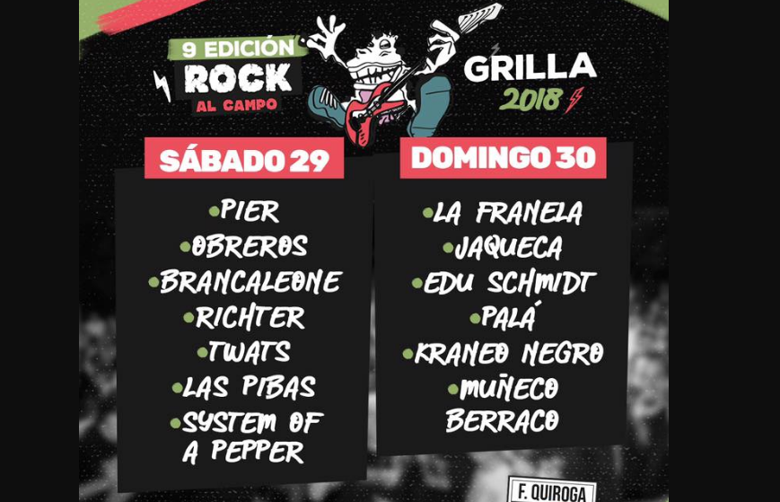 La grilla de bandas confirmadas para este nuevo “Rock al Campo” está integrada por System of Pepper, Las Pibas, Twats, Richter, Brancaleone, Obreros, Pier, Muñeco Berraco, Kraneo Negro, Palá, Edu Schmidt, Jaqueca y La Franela.
