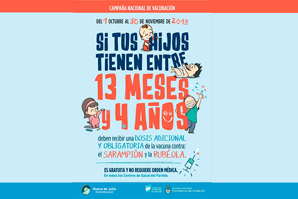 La Secretaría de Salud de la Municipalidad de Nueve de Julio recuerda continúa llevándose adelante la campaña de vacunación contra el sarampión y la rubéola, para niños de entre 13 meses y 4 años de edad, quienes deben recibir una dosis adicional y obligatoria, la que finalizará el día viernes 30 del corriente.