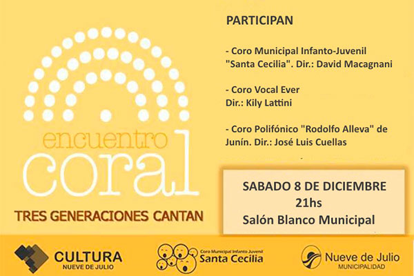 Este próximo sábado 8 de diciembre, a las 21 hs., en el Salón Blanco del Palacio Municipal, con la organización del Coro Infanto Juvenil Santa Cecilia y el auspicio de la Municipalidad de Nueve de Julio, se presentará el evento “Tres Generaciones Cantan”, en el que junto a la agrupación anfitriona que dirige el Prof. David Maccagnani, se presentarán Coral Ever de nuestra ciudad y dirigido por Kily Lattini y el Coro Polifónico “Rodolfo Alleva” de la ciudad de Junín, dirigido por José Luis Cuellas.