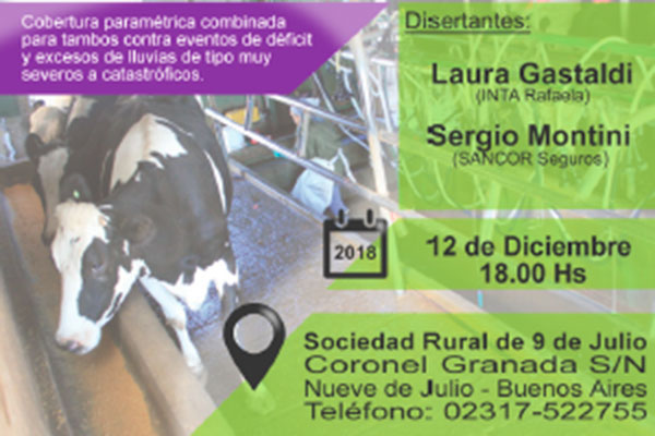 El miércoles 12 de diciembre, a las 18 hs. tendrá lugar en la sede de la Sociedad Rural de 9 de Julio  la presentación de la propuesta de plan piloto para la implementación de la cobertura climática para tambos, desarrollada por INTA Rafaela y Sancor Seguros como una herramienta destinada al manejo de riesgos por parte de los productores tamberos.