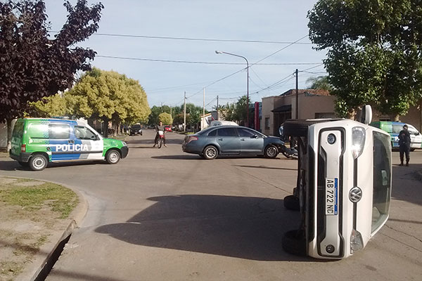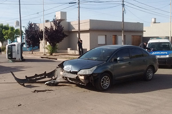 En la intersección de calles Arturo Frondizi y Freyre de nuestra ciudad, minutos antes de las 08,00 hs. de la víspera, se produjo una fuerte colisión protagonizada por dos vehículos, uno de los cuales terminó volcado sobre uno de los laterales.