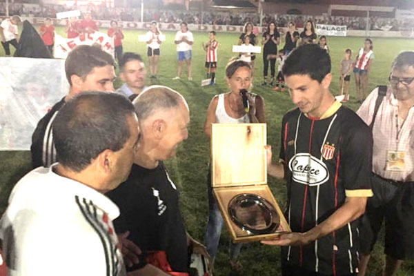 Tras el cotejo, el homenajeado recibió una copia de la ficha de ingreso como jugador de la Liga Nuevejuliense, una gigantografía con la Copa Libertadores y una Réplica del trofeo continental, recientemente ganada junto al Club millonario, lo que hizo que al dirigirse al público, el joven futbolista se emocionara, recibiendo el aplauso de los presentes.