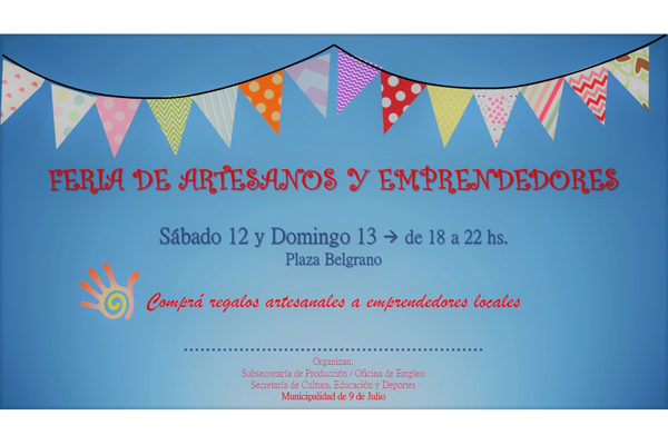 Este fin de semana (sábado 12 y domingo 13 de enero) en Plaza Belgrano, y de 18 a 22 hs., se desarrollará una atractiva Feria de Artesanos y Emprendedores, promovida a través de la Subsecretaría de Producción y la Oficina de Empleo de la Municipalidad de Nueve de Julio, junto a la Secretaría de Cultura, Educación y Deportes.