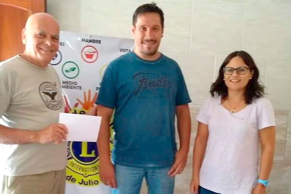 El tesorero del Club de Leones de 9 de Julio, Rubén Avila; junto a la convecina Nora Baez, integrante de la entidad, entregaron a Gustavo Ressia la orden de compra de $ 15.000 correspondiente al sorteo mensual mes de enero.