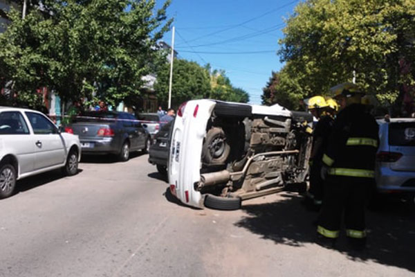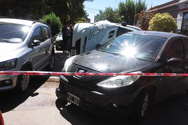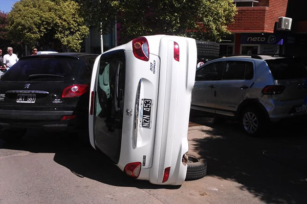 Cerca del mediodía de la víspera, sobre calle La rioja, entre Robbio y Mendoza, se produjo un espectacular accidente de tránsito, en el que se vieron involucrados cuatro vehículos –dos de ellos estacionados y dos en circulación, quedando uno de estos últimos volcado sobre su lateral-.