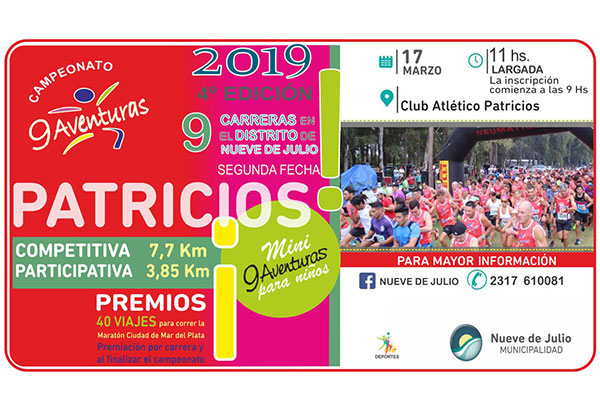 A través de la Dirección de Deportes de la Municipalidad de Nueve de Julio el Campeonato “9 Aventuras”, que abarca 9 competencias atléticas en el partido y sumó una notable cantidad de atletas en su apertura, en la localidad de Morea; llevará a cabo este domingo la segunda fecha de su calendario 2019, la que tendrá lugar en la localidad de Patricios, con largada a las 11 hs., desde la sede del Club Atlético.