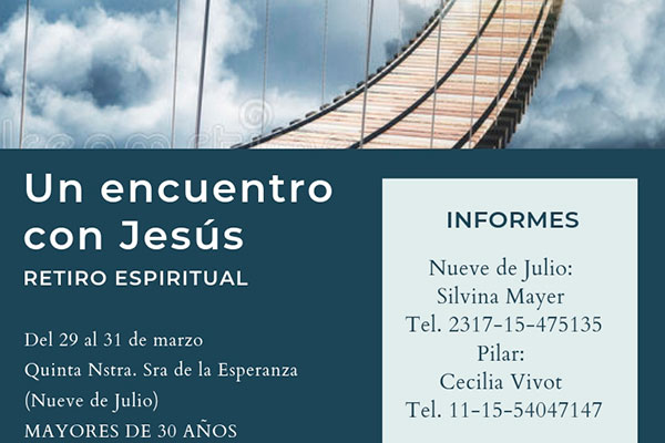 El retiro, llamado “Un encuentro personal con Jesús”, es abierto a toda persona mayor de 30 años. Comenzará el viernes 29 de marzo a las 19 hs. y concluirá el domingo 31 con la misa de cierre a las 19,00 en la Iglesia Catedral Santo Domingo de Guzmán.
