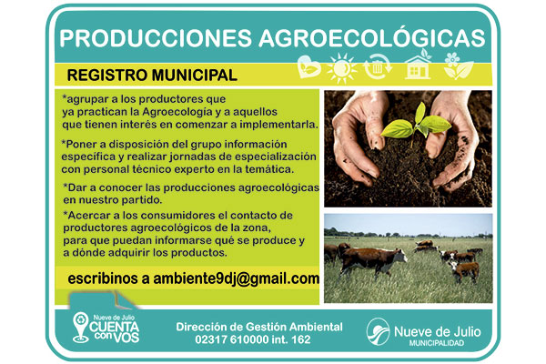 La Municipalidad de Nueve de Julio, a través de la Dirección de Gestión Ambiental, ha abierto el Registro de Producciones Agroecológicas, con el objeto de agrupar productores actuales y futuros, poner a disposición información al respecto y dar a conocer la actividad para que los consumidores sepan a dónde adquirir los diferentes productos.