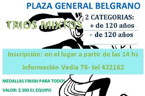 Con la organización del CEF Nª101, el sábado 6 de abril desde las 15 hs., se realizará la denominada “Carrera de la Hora”. La carrera es en tríos mixtos en forma de relevos, al comenzar la prueba el primero de los participantes de cada equipo dará una vuelta a la plaza, pasándole la posta al segundo (que hará lo mismo) y este al tercero, así repitiendo durante 60 minutos de competencia.