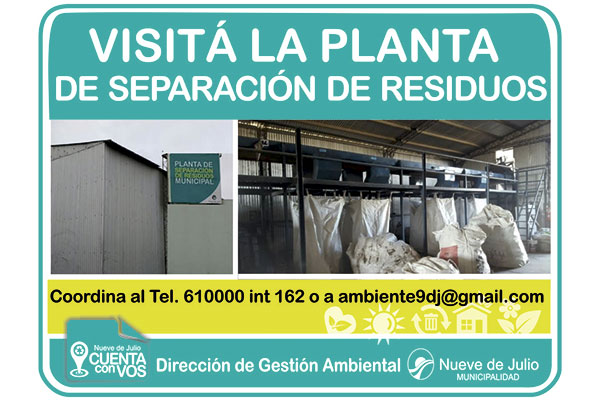 La Dirección de Gestión Ambiental de la Municipalidad de Nueve de Julio informa que se halla abierta la posibilidad de coordinar visitas a la Planta de Separación de Residuos, para conocer el proceso de recuperación de residuos reciclables y el trabajo que allí se realiza.