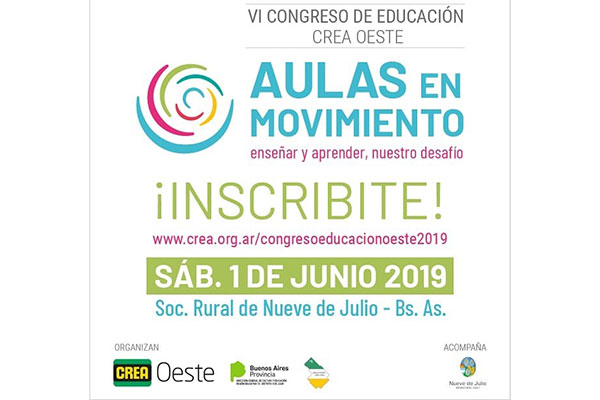 Con la organización del Grupo CREA Oeste y la Dirección de Cultura y Educación de la Provincia de Buenos Aires, y el acompañamiento de la Municipalidad de Nueve de Julio; el sábado 1ero. de junio, en las instalaciones de la Sociedad Rural de 9 de Julio, se desarrollará el VI Congreso de Educación CREA Oeste “Aulas en movimiento”, enseñar y aprender nuestro desafío.