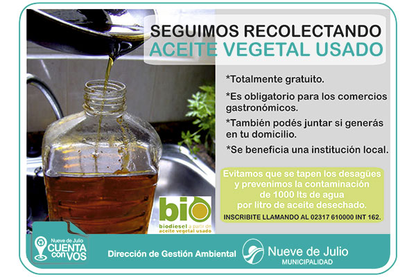 La Dirección de Gestión Ambiental de la Municipalidad de Nueve de Julio realizó en el mes de marzo pasado una nueva recolección de aceite vegetal usado, superándose los 2.000 litros.