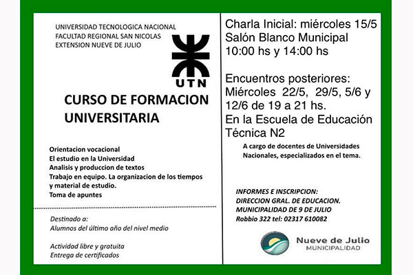 La Dirección de Educación de la Municipalidad de Nueve de Julio lanzará un nuevo curso que se habrá de dictar de manera conjunta con la Universidad Tecnológica Nacional (UTN), y dictado por docentes de la misma, con el objetivo de preparar a los alumnos para el ingreso a la Universidad.