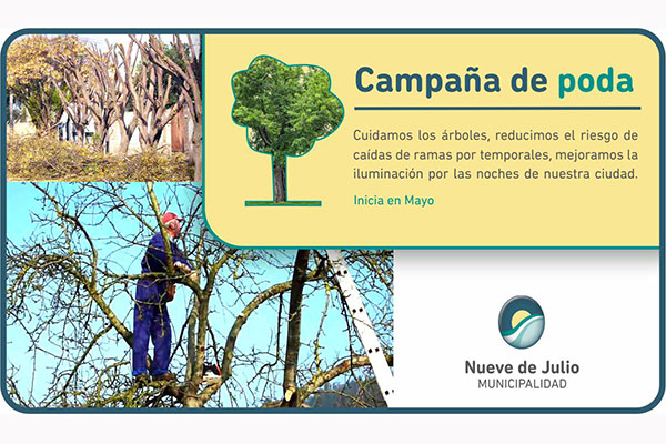 La Municipalidad de Nueve de Julio, a través de la Subsecretaría de Espacios Verdes y Control de Plagas, dará inicio en los próximos días a una nueva campaña de poda del arbolado urbano con una modalidad formativa para los distintos ejemplares, en los que se trabaja desde abajo hacia arriba, suprimiendo las ramas que impiden el normal paso de peatones –hasta 2 metros-, como así también aquellas que tapan las luminarias de alumbrado.