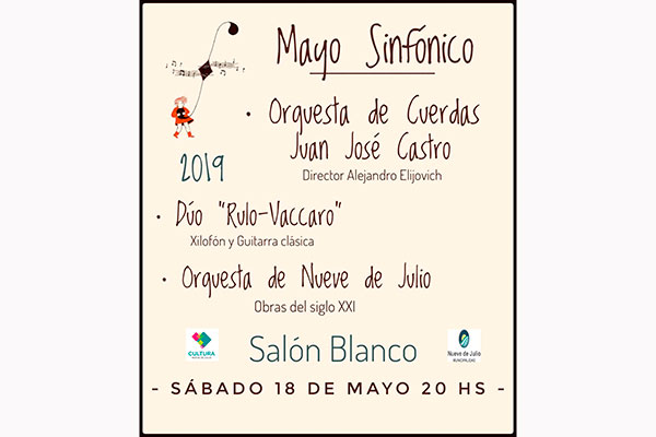 Este próximo sábado 18, a las 20 hs., en el Salón Blanco Municipal, la Dirección de Cultura de la Municipalidad de Nueve de Julio, dará continuidad al ciclo “Mayo Sinfónico”, con las presentaciones de la Orquesta de Cuerdas Juan José Castro, dirigida por Alejandro Elijovich; el dúo Rulo – Vaccaro (xilofón y guitarra) y la Orquesta de Nueve de Julio, que interpretaráobras del siglo IXX.