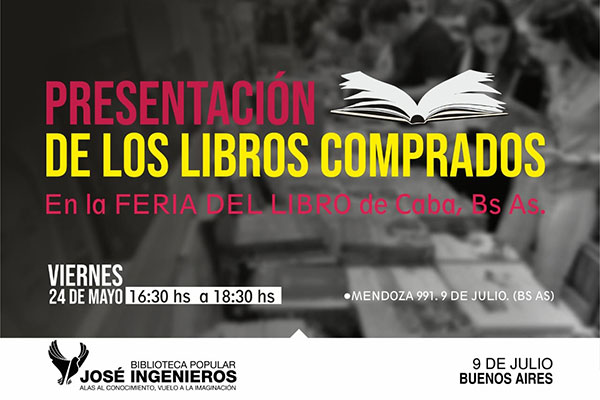 Con la intención de compartir con la comunidad la emoción con la que se vivió la Feria Internacional del Libro de Buenos Aires, la Biblioteca Popular José Ingenieros invita a sus socios y no socios para el viernes 24, de mayo, a compartir mate, té, café y algo rico para comer; oportunidad en la que se van a contar todas las novedades adquiridas en la Feria, cuya gran mayoría van a estar a disposición para ser prestados.