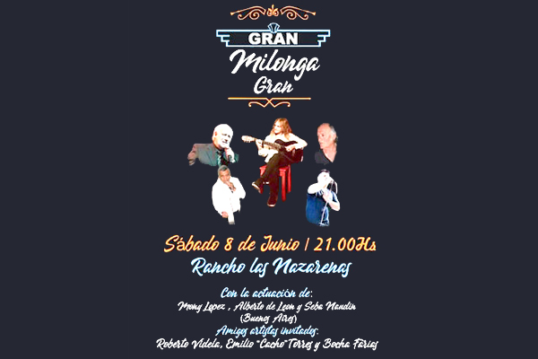 Con el auspicio de la Dirección de Cultura de la Municipalidad de Nueve de Julio, este próximo sábado 8, desde las 21 hs., se desarrollará en el Centro Folkórico “Las Nazarenas” una gran Milonga, con las presentaciones de Mony López, Alberto de León y Seba Naudín; a quienes se sumarán artistas nuevejulienses invitados como Roberto Videla, Emilio Torres y “Bocha” Farías.