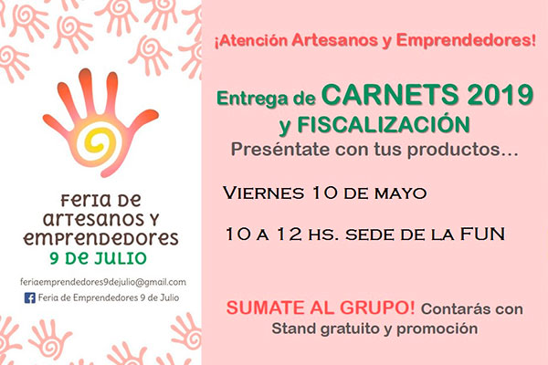 Este próximo viernes 14 de junio se llevará a cabo la fiscalización y entrega de Carnets 2019 para artesanos y emprendedores de la ciudad, de 9 a 12 hs. en la sede de la FUN de calle Robbio 322.