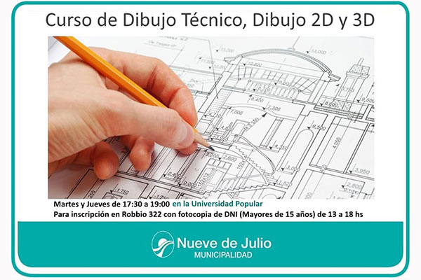 La universidad Popular de Nueve de Julio, abre la inscripción para un nuevo curso gratuito de dibujo técnico, dibujo 2D y 3D, el que se dictará desde el 2 de julio próximo; todos los martes y jueves de 17,30 a 19,00 hs., previa inscripción con DNI en la sede de la misma, de Robbio 322, de 15 a 18 hs. Es condición indispensable ser mayor de 15 años de edad.