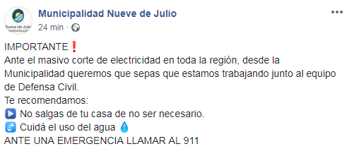 Mensaje de la Municipalidad ante el masivo corte de electricidad en toda la región