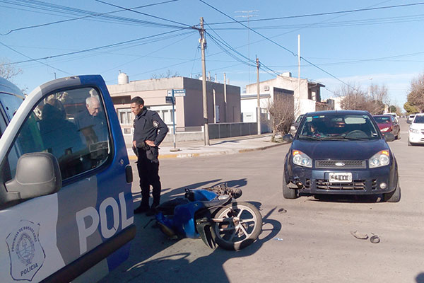 En horas del mediodía del pasado miércoles, por cuestiones que se tratan de establecer, colisionaron en la esquina de Avda. San Martín y Lagos un automóvil Ford Fiesta y una motocicleta Motomel.
