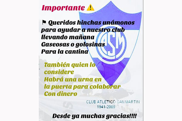 No obstante, al tomarse conocimiento de lo sucedido, padres, colaboradores y socios de San Martín se acercaron con donaciones para reponer lo sustraído, en una positiva iniciativa solidaria que continuó desarrollándose ayer, durante el cotejo de primera división entre El Santo y Defensores de la Boca.