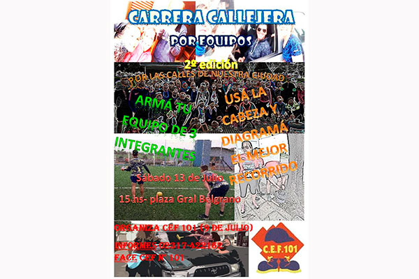 La segunda edición de la “Carrera Callejera”, con la organización del Centro de Educación Física (CEF) Nro. 101, se desarrollará en la jornada del sábado 13 en la Plaza general Belgrano de nuestra ciudad, desde las 15 hs.