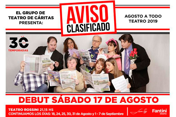 Este próximo sábado 17, Grupo de Teatro de Cáritas 9 de Julio pondrá en escena la 30º temporada del ciclo “Agosto a Todo Teatro”, con el estreno de “Aviso Clasificado”; luego de un último ensayo general a modo de “avant premiere”, que se realizará mañana jueves, a las 21 hs., para invitados especiales y medios de comunicación.