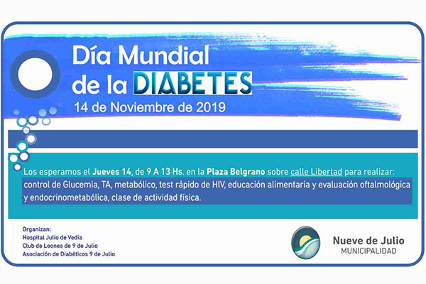 Con motivo de conmemorarse el próximo 14 de noviembre el Día Internacional de Lucha Contra la Diabetes, desde la Secretaría de Salud de la Municipalidad de Nueve de Julio, conjuntamente con el Club de Leones, la Asociación de Diabéticos y el Servicio de Endocrinología del Hospital Julio de Vedia, de 9 a 13 hs., en Plaza Belgrano, se desarrollará una Jornada Saludable, con el objetivo de fomentar los hábitos saludables y concientizar sobre la importancia de los controles metabólicos y oftalmológicos y realizar test rápidos a la población.