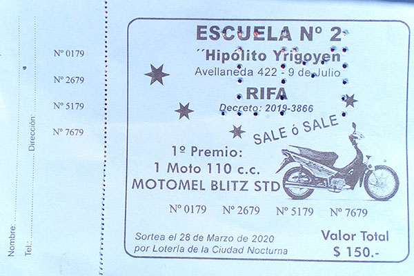 La Escuela Nº2 ha puesto en circulación un Bono Contribución, cuyo primer premio es una motocicleta Motomel Blistz std 110cc.