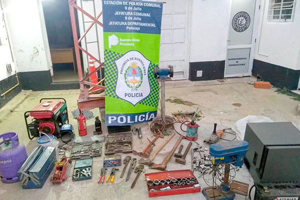La Estación de Policía Comunal de Nueve de Julio informó que el pasado Viernes24, personal de este elemento junto a personal de SUB DDI Bragado, personal de CPR General Viamonte, DDI Junin y CRP 9 de Julio; en un taller emplazado en calle Urquiza 2.400 de esta ciudad, procedió a secuestrar un grupo electrógeno marca Sensei, un matafuego, una máscara de soldar, 4 cajas de llaves de tubos completas, un criquet, una caja de herramientas de metal conteniendo en su interior herramientas de manos varias, tres llaves de stilson, dos remachadoras, un hacha, un inflador, dos masas, una moladora marca Dowen Pagio, una grasera, una batería, una heladera de de 12 volt, una agujereadora, una piedra de esmerilar con su base de apoyo, una grasera neumática y un cajón de herramientas, elementos estos que fueron sustraídos con fecha 11/01/20 en Cuartel III de la localidad de General Viamonte bajo la modalidad robo; a lo que se suma un envase de garrafa de color violeta marca Extragas, la cual había sido sustraída con fecha 17/11/2019 en la Zonal Rural de El Tejar , como así también una carabina calibre 22 marca Mahely con mira telescópica y silenciador con cargador colocado alojando 7 municiones intactas del mismo calibre, la cual hasta el momento no posee impedimentos legales y se trata de establecer propiedad de la misma.
