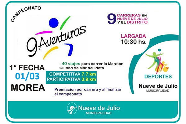 La Dirección de Deportes de la Municipalidad de Nueve de Julio pondrá en marcha la quinta edición del campeonato de maratones “9 Aventuras”, el domingo 1ero. de marzo en la localidad de Morea, con largada a las 10,30 hs., desde la sede del Club Social y Deportivo, donde se contará con servicio de cantina.