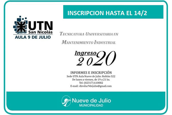 Dirección de Educación de la Municipalidad de Nueve de Julio recuerda que se encuentra abierta hasta el viernes 14 de febrero la inscripción para la carrera de Tecnicatura Universitaria en Mantenimiento Industrial, que se iniciará sobre fines del mismo mes, con el curso introductorio.