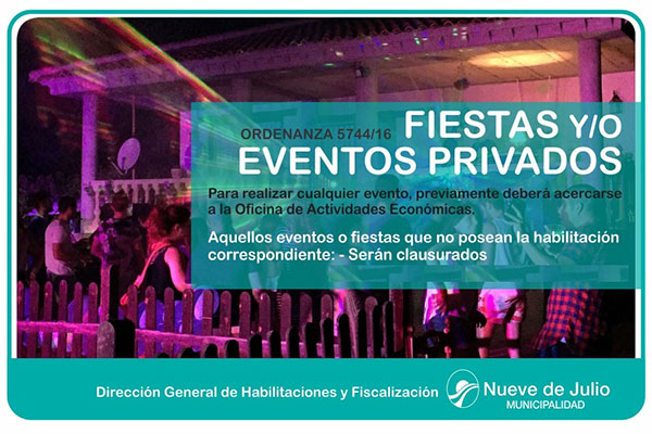 La Municipalidad de Nueve de Julio, a través de la Dirección General de Habilitaciones y Fiscalización, recuerda la plena vigencia de la Ordenanza 5744, del año 2016, que regula la realización de fiestas y/o eventos privados, la que tiene por objeto “regular las fiestas y/o eventos que se desarrollen en inmuebles de dominio privado, ya sean vivienda particular, quinta, casa de campo, finca, galpón o cualquier otro tipo similar, situado dentro del Partido de Nueve de Julio; que sean abiertas al público en general, concurran más de 100 personas, y se cobre un canon, entrada o retribución de cualquier tipo y en cualquier momento; y/o se comercialicen bebidas y/o comidas…”.