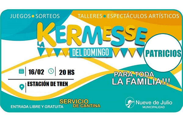 La Dirección de Cultura de la Municipalidad de Nueve de Julio dará continuidad a su ciclo de Kermesses libres y gratuitas 2020, en la Estación de Tren de la localidad de Patricios, y desde las 20 hs.