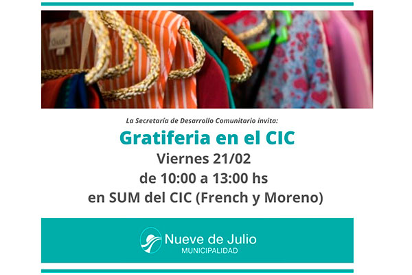 La Municipalidad de Nueve de Julio, a través de la Secretaria de Desarrollo Comunitario, invita a todos los vecinos a participar de la “Gratiferia” organizada por el Ropero Comunitario del CIC.