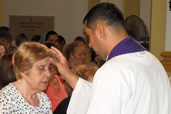 Luego de pronunciar su homilía, los padres Guillermo Gómez y José Pedraza trazaron la tradicional cruz con cenizas sobre la frente de los fieles mientras decían a cada uno “conviértete y cree en el Evangelio”.