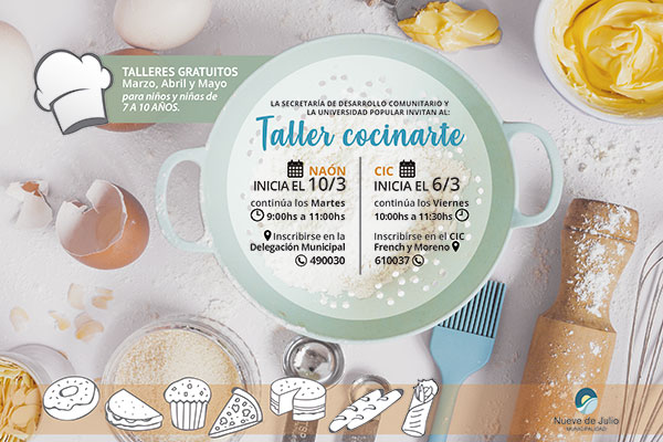 Mujeres emprendedoras de nuestra ciudad, contando con la organización y apoyo de los Centros de Atención Primaria de la Salud (CAPS), el CIC y la Oficina de Empleo de la Municipalidad de Nueve de Julio, dan continuidad a los talleres gratuitos de pastelería y arte “Cocinarte”, destinados a niños y niñas de 7 a 10 años, en forma libre y gratuita, que se desarrollarán en el CIC y en la localidad de Carlos María Naón.