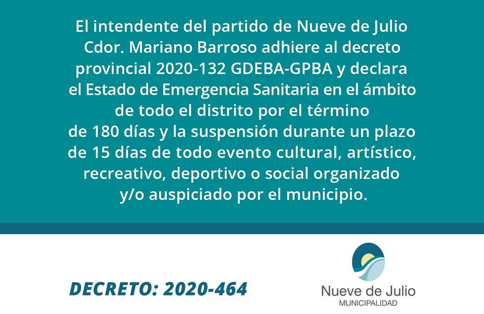 El Intendente Municipal de Nueve de Julio, Mariano Barroso, firmó en la mañana de hoy un decreto que adhiere al decreto provincial 2020-132 GDEBA –GPBA y declara el Estado de Emergencia Sanitaria en el ámbito de todo el distrito de Nueve de Julio por el termino de 180 días y la suspensión durante un plazo de 15 días de todo evento cultural, artístico, recreativo, deportivo o social organizado y/o auspiciado por el municipio de participación masiva en el partido.