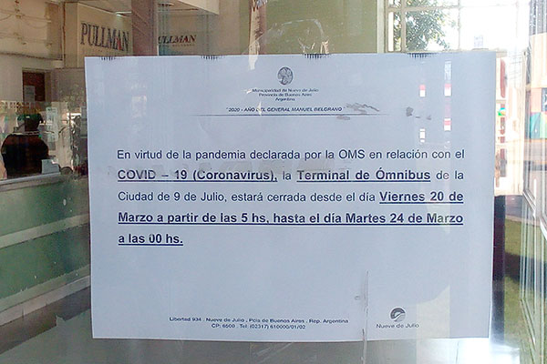 Ante la vigencia del decreto que establece que desde la 00:00 horas del viernes se paralizará totalmente la circulación de aviones, trenes y micros de larga distancia en todo el país y habrá severos controles en las rutas para desalentar el turismo interno, la terminal de Omnibus de nuestra ciudad, permanecera totalmente cerrada en la jornada de hoy.