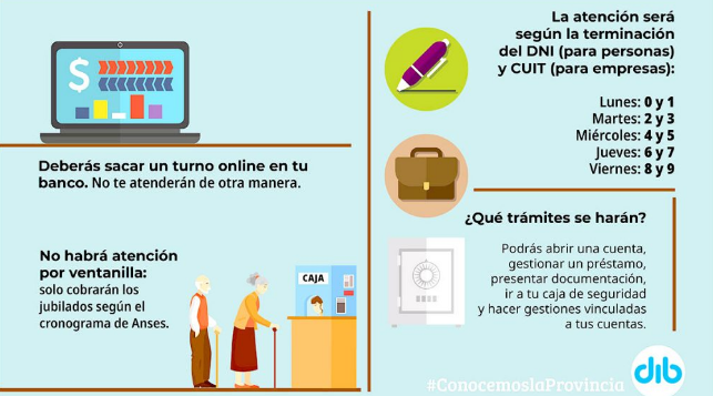 Además, la entidad ordenó ampliar en dos horas el horario de atención, por lo que en la provincia de Buenos Aires las sucursales abrirán entre las 10 y las 17 horas. Por otro lado, se dejó en claro que solo se atenderá a las personas que haya obtenido desde este miércoles un turno previo a través de las terminales web que cada banco tiene a disposición de sus clientes. Sin ello no se les permitirá el ingreso.