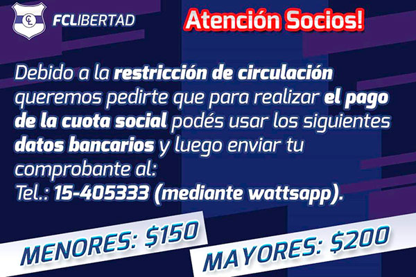 El Foot Ball Club Libertad de nuestra ciudad comunicó a sus socios que pueden efectuar el pago de la cuota social a través de la cuenta corriente de la entidad en Banco Provincia (Nro. 50479/3, sucursal 6478 CUIT 30530685078 CBU 014033890164785047934, enviando luego el comprobante al whatsapp al 15-405333.