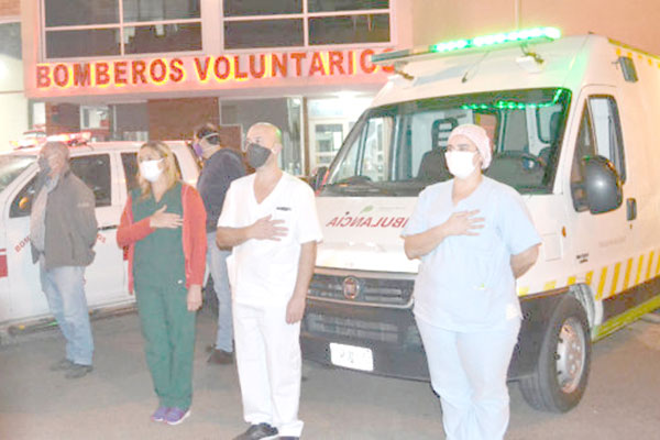 El Cuartel de Bomberos Voluntarios de 9 de Julio llevó a cabo en la noche de este pasado viernes, frente al edificio, un reconocimiento a enfermeros, médicos, policías, personal de tránsito y voluntarios que trabajan para enfrentar la pandemia de Covid-19.