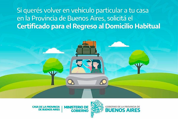 Si sos residente de la provincia de Buenos Aires y querés regresar a tu domicilio habitual en un vehículo particular, accedé a la web https://regresoacasa.gob.gba.gob.ar/ y completá el formulario para solicitar el “Certificado para el Regreso al Domicilio Habitual”. Sólo es necesario realizar un formulario por titular del viaje, detallando cada uno de los acompañantes, si los hubiera. En el caso que el conductor fuera una persona distinta que te va a buscar a vos y a tus acompañantes, tenés que completar el formulario con sus datos.