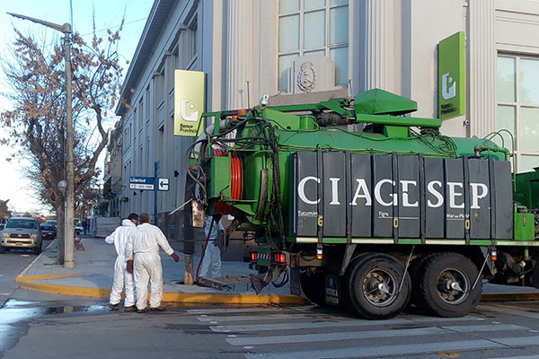 A lo largo de la tarde del día sábado, un camión de gran porte realizó trabajos de desobstrucción cloacal en pleno centro de la ciudad, trabajando en la intersección de Mitre y Libertad, como lo muestra la toma gráfica.